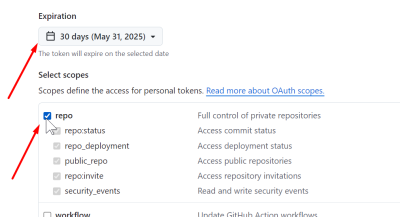 generar un nou token. S'ha d'indicar un nom, una durada i donar-li permisos per a repo, un cop generat el sistema el mostrarà a pantalla UN SOL COP i serà el password que s'haurà de fer servir a partir d'aquell moment per fer servir git amb github des de la línia d'ordres.
